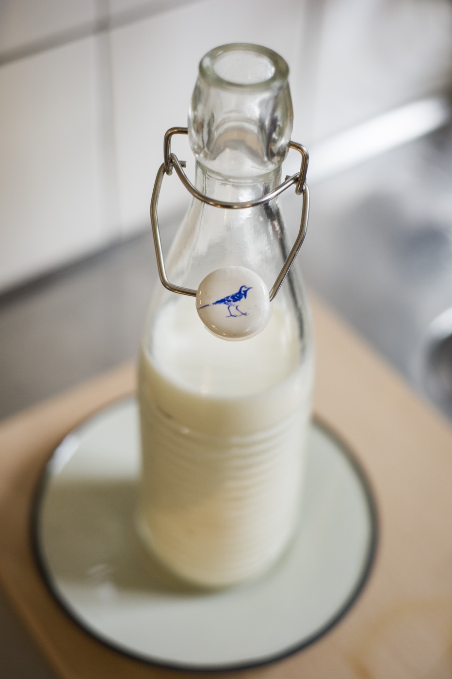 Glasflaska med porslinskork med fågeltryck. Flaskan är 27cm hög och har ränder i glaset. Mysig att ha till vattenflaska saftflaska m.m.